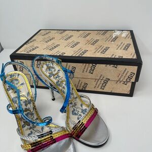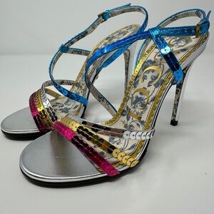 Elevate your style with this stunning pair of Gucci strappy heels. The multicolor floral pattern and rainbow sequin accents on the insole make these shoes a perfect choice for any occasion, whether it's a casual outing, a formal event, or a party. The lightweight and limited edition features of these shoes, along with the ankle strap and stiletto heel style, make them a must-have for any fashion-forward woman.