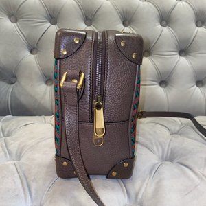 Historic patterns and codes are combined and refreshed each season with a Gucci twist. Interpreted using the colors of the House Web, the Houndstooth motif is presented as a striped design that mixes with Guccio Gucci's monogram. The shoulder bag's shape is emphasized by leather accents.