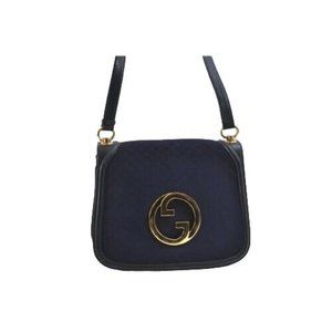 Gucci has recently re-released the Blondie, so it is now more than ever a must have! The bag is a large, envelope top, saddle bag style, shoulder purse. The purse is from blue micro Guccissima print canvas and navy blue leather with an extra large, cut out gold 'GG' emblem. To close, there is a snap below the open, large GG medallion. The strap is adjustable in length and there is minimal wear to the exterior. There is very little wear on the piping or strap- the owner took excellent care of this purse.This is the Rolls Royce of vintage Gucci purses!