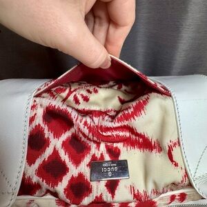 The abstract floral canvas on the exterior pops in contrast to the white leather handles and accent stripes. The bottom of this bag has five silver toned feet. One large zipper opens up this beautiful bag to a stunning red Gucci nylon interior with an additional large interior zippered pocket to help keep all of your items organized.
