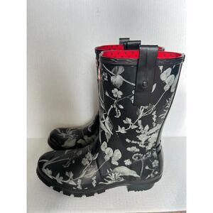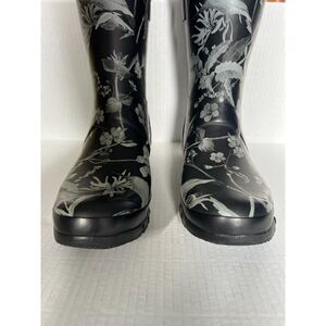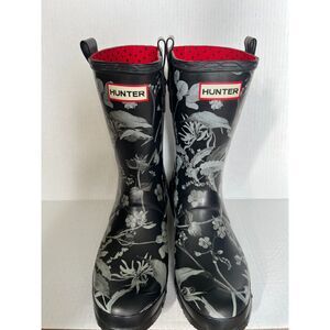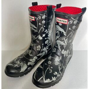 RARE HUNTER Royal Horticultural Society Floral Black Rain Boots Womens 9 US