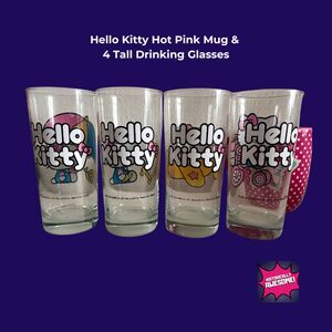 RARE Hello Kitty Glassware Unused— Hot Pink Mug and 4 tall drinking glasses