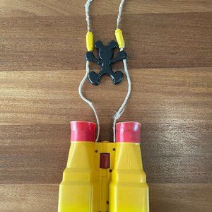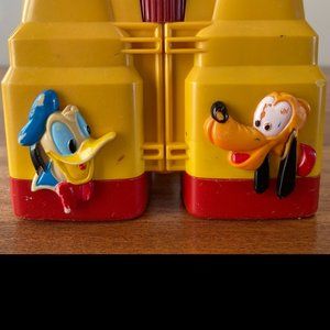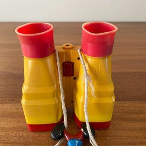 Fun vintage Walt Disney’s Mickey Mouse Binoculars Binoculars by ILLCO, featuring the iconic Mickey Mouse, Donald Duck and Pluto cartoon characters! This wonderful toy has a colorful yellow body with durable red plastic on the front lenses, a wrap-around safety strap with a sliding Mickey Mouse figure, soft comfortable eye pieces, hinged to fit distance between the child’s eyes, and a large adjustable eye focusing thumbwheel. Designed for ages over 3 years old for hours of fun exploration and imaginative play!