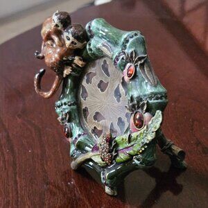 This is an AUTHENTIC RETIRED Jay Strongwater Frame. This RARE frame was purchased from Neiman Marcus many years ago and made EXCLUSIVELY for Neiman Marcus. This CLASSIC frame is done in a Jungle pair of Monkeys and floral design with a Bamboo surround. A STUNNING design for your photo or a jungle home decor!! The back and trim is done in an antique gold-tone. The back also bears the Jay Strongwater name and further accented with a lovely design. The entire frame is accented in Swarovski crystals. A classic frame and wonderful accent to any home decor. Overall frame measures approximately 3 1/2"L by 4"W by 2 1/4" deep. It holds an oval picture that measures 2"L x 2"W. Used for a brief time in an office and then stored away. Please check out my other auctions for other Strongwater items. Pictures are of actual item. I will be happy to combine shipping!!! THANKS so much for looking!