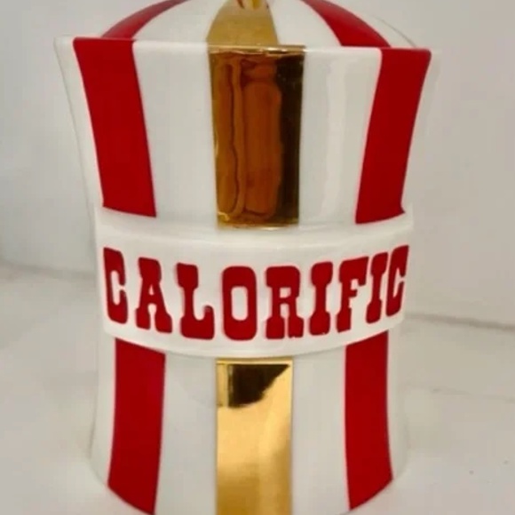 The round ceramic canister features a candy stripe pattern in red, gold and white, with a lid that comes with a handle for easy access. The airtight canister measures 6 inches in height and 4 inches wide.