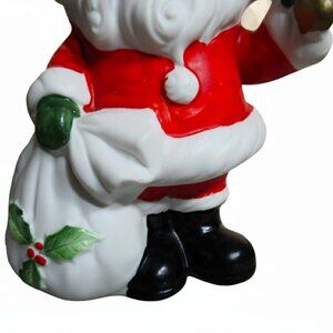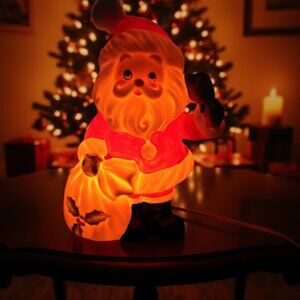 Bring a piece of classic Mid-Century Christmas nostalgia to your home with this beautiful and hard-to-find Josef Originals Illuminated Santa Figurine Lamp. This cheerful ceramic Santa, holding his sack of toys and ringing a golden bell, lights up to cast a warm holiday glow.