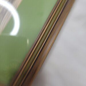The print is mounted in a wood frame with a green mat and an inner narrow line of cream. The framed measurements are approximately 14 by 18 inches. The dust paper on the back is intact, with a hanging wire in place. The artist signed it in the plate, lower right. It's in excellent condition, with some distressing to the frame, but no damage to the glass, mat or print itself. Just elegant and lovely in any room...