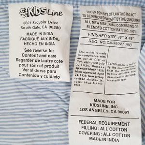 Price is FIRM. This is a RARE KIDSLINE CLASSIC ALPHABET STRIPE BABY NURSERY CRIB COMFORTER QUILT THROW. It is BRAND NEW and in the ORIGINAL bag. It was purchased MANY years and NEVER USED nor NEVER DISPLAYED. It comes from a non-smoking home. It has the CLASSIC alphabet and a picture starting with each letter of the alphabet. It is striped on the other side. Appears you could reverse it. This is a comforter for a crib. Pictures of actual item.