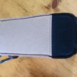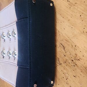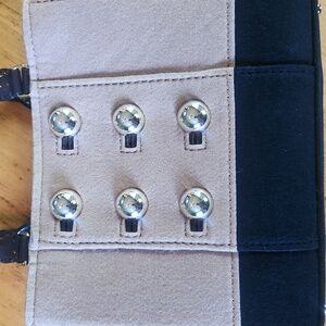 Divided with zipper pouch in middle. Additional zipper pocket on one side and 2 slip pockets on other.
