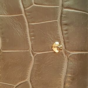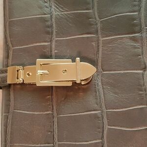 One side has a Kate Spade tag and gold spade logo and houses a removable grey cow suede wristlet with gold hardware and cow leather strap. The other side has two pockets with 6 card slots. No original dust bag or packaging.