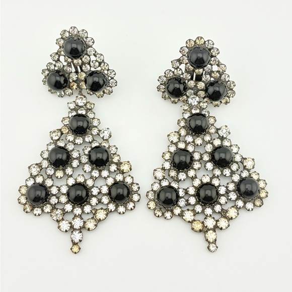 Kenneth Jay Lane 1960's Clip Ons black and clear rhinestone earrings Prong set stones and cabochons with the desirable K.J.L mark on each clip.