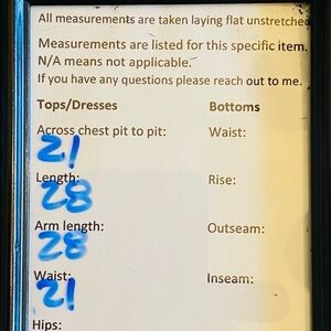 Pit to pit: 21", length 28”, arm length 28", waist 21"