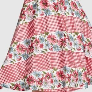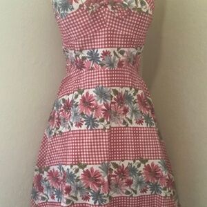 This is not a plus size garment. It has some stretch panels but they're really more for fit and you shouldn't overstruct them. Because this is a true heritage style vintage reproduction there's not any stretch in this fabric. It is a red ging I'm not pink. Absolutely gorgeous! The Shellie dress also has boning in the bust cups, sheared back panels for great comfortable fit and adjustable straps with buttons so it can be worn as a halter style the skirt is a full share flared A lined shape and has side seam pockets!