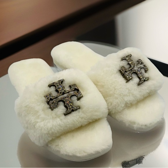 RARE LIKE NEW! Tory Burch Jeweled Shearling Slide Slippers Shoes Buttermilk