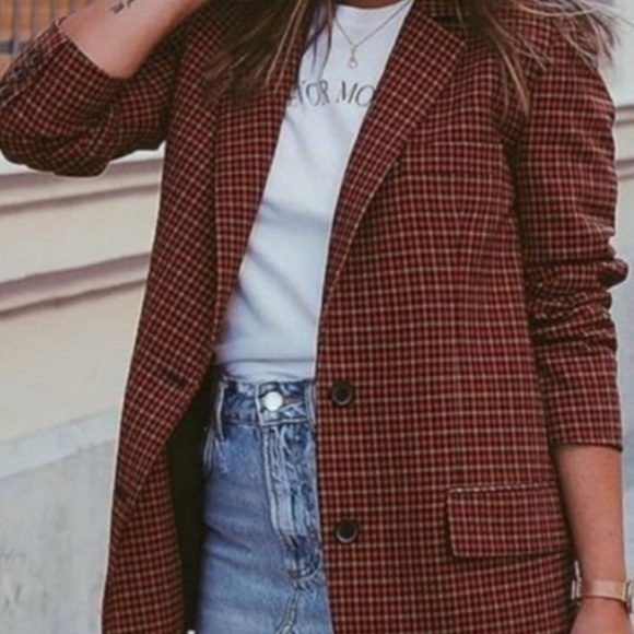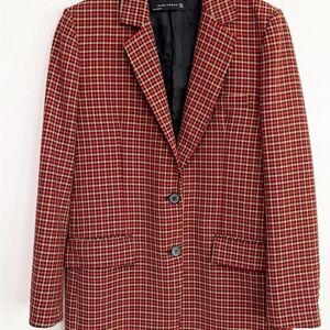 RARE LIKE NEW! Zara Burgundy Checkered Blazer Tops Shirts Womens Size XS