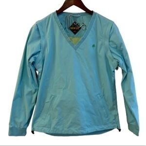 This jacket is in great condition! Sleeves zip off to wear as a vest. Kangaroo pockets in the front with zippers. Zipper pouch in the back. Waist has a draw string. True to size. 100% polyester. Machine wash.