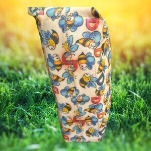 This bag features a whimsical bumblebee and "D" logo pattern on a light-colored coated canvas body with tan leather trim and handles. It has a drawstring closure with a tassel. It is a tote or shopper-style handbag with double handles. The exterior is made of coated canvas with leather accents.