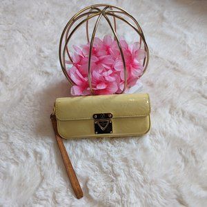 RARE LOUIS VUITTON Vernis Pochette lagoon Glasses Case in Perle but looks Sunny yellow. LV vernis sunglasses case or Wristlet. You can take the sunglass nose piece out and use as a wristlet. Fits cards, cash, and key fob. Some phone may fit, I have a Google pixel 6 pro and it fits but is tight. Closure works, some minor wear on wristlet, see pics for fading and minor cracks.vachetta is in good condition.