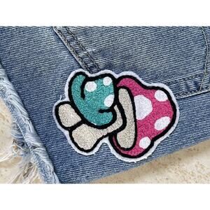 The product is a very rare pair of Levi's Fault Line Cutoff Denim Shorts in size 27. Hard to find pink back label and white enamel button. These shorts feature a unique floral and mushroom patches on a light fabric wash. Made from 100% cotton denim, they have a high-rise waist and come with pockets for added convenience. The 70s-themed design adds a stylish touch to this cut-off style, making it a standout piece in any woman's wardrobe.