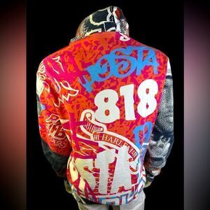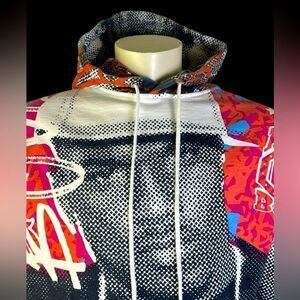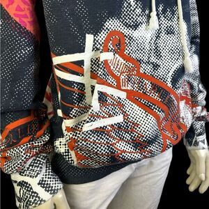 Amazing limited edition collaboration L/S hoodie sweatshirt from Posta Boys and Diplomats available in like new condition! Super rare opportunity! It features a wild graphic design in navy, cream, orange, light blue and hot pink, with large front kangaroo pocket and hood with drawstring closure. It is a high quality, heavyweight fabric and an oversized large measuring: