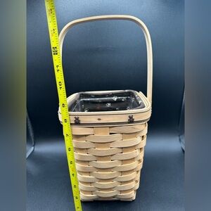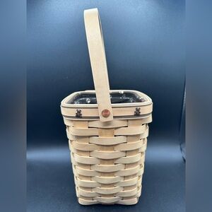 Hard to find basket with liner & protector, in excellent condition. No lid or tie on. Signed by Wendy Longaberger