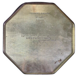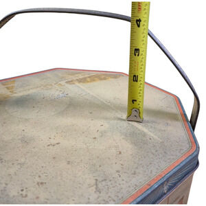 This tin is in good condition for its age! It is a RARE collectible from the 1939 World's Fair in New York. It is octagon shaped and has a tin handle. Inside the tin is a shiny gold/brass tone color. It measures 9.25" across, and 3.25" high. The tin handle rises 4" above the lid