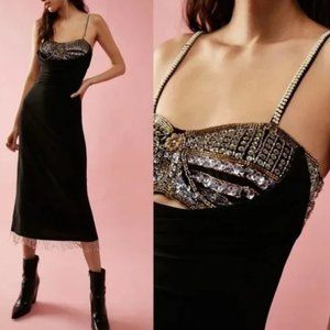 For any special event, this stunning midi dress is featured in a slinky silhouette with jewel-adorned top piecing, beaded shoulder straps, and metallic fringe at bottom hem for an added sparkly touch. Classic, A-line style. Hook back and hidden zip closure, adjustable shoulder straps, cutout detail at front, bustier-inspired piecing at top. The coolest take on a forever classic, this gorgeous midi is the perfect piece to pair with a staple stiletto or a bold boot for effortless edge. Shoulder seam to hem measures approx 60" in length. Because straps are adjustable, length may vary.