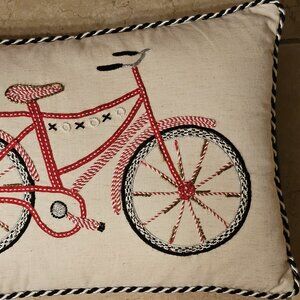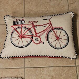 This is for a Mackenzie Childs Bicycle Throw Pillow. This BEAUTIFUL pillow was purchased directly from Mackenzie Childs. CHARMING bicycle accented with Courtly Check pattern and Love and XoXo accents. This is a 14x20 pillow. Front is 88% cotton, 12% linen. Back is made of 100% cotton. The lining is 100% cotton. It comes from a non-smoking. This is pre-owned and was used briefly in a loft before the decor was changed. Pictures of actual item.