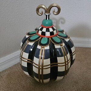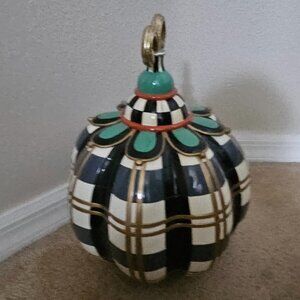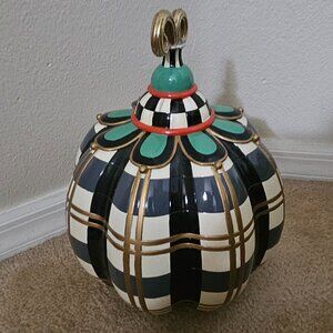 This is an AUTHENTIC RARE MACKENZIE CHILDS GRAY PLAID PUMPKIN. VERY RARE! Take your pick from our most unusual pumpkin patch. The Orange Plaid Tartan Spice Pumpkin is decorated with a hand-painted plaid pattern and topped with a unique knob that has MacKenzie-Childs style. You’ll want to make this gorgeous gourd a seasonal staple right through Thanksgiving. The Plaid Pumpkin is a spooky celebration of the classic combination of gray, white, orange, greenish-blue, and black, with a touch of gold. LOVELY Colorful plaid patterned accents this LOVELY pumpkin! This was purchased directly from Mackenzie Childs. CLASSIC and WONDERFUL addition to any decor or kitchen!! Add a seasonal staple with touch of glitz to your Halloween decor and this gorgeous gourd a seasonal staple right thru Thanksgiving. Measures approximately 9" wide by 14" tall. Made of resin. Due to the hand-made nature of these pieces...each may vary. Imported. Wipe with a soft, damp cloth. Comes from a non-smoking home.