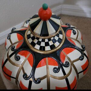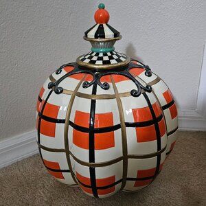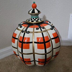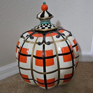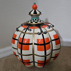 This is an AUTHENTIC RARE MACKENZIE CHILDS GRAY PLAID PUMPKIN. VERY RARE! Take your pick from our most unusual pumpkin patch. The Orange Plaid Tartan Spice Pumpkin is decorated with a hand-painted plaid pattern and topped with a unique knob that has MacKenzie-Childs style. You’ll want to make this gorgeous gourd a seasonal staple right through Thanksgiving. The Plaid Pumpkin is a spooky celebration of the classic combination of orange, white, greenish-blue, and black, with a touch of gold. LOVELY Colorful plaid patterned accents this LOVELY pumpkin! This was purchased directly from Mackenzie Childs. CLASSIC and WONDERFUL addition to any decor or kitchen!! Add a seasonal staple with touch of glitz to your Halloween decor and this gorgeous gourd a seasonal staple right thru Thanksgiving. Measures approximately 15" wide by 15" tall. Made of resin. Due to the hand-made nature of these pieces...each may vary. Imported. Wipe with a soft, damp cloth. Comes from a non-smoking home.