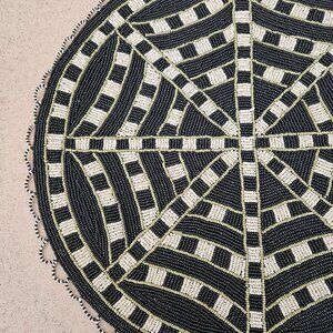 This is an AUTHENTIC MACKENZIE CHILDS SPIDER WEB COURTLY CHECK PLACEMAT/CENTERPIECE/CHARGER. This comes from a non-smoking home. It is a spider web-shaped beaded placemat/centerpiece and accented with Courtly Check design. This is a VERY RARE placemat and RETIRED LONG AGO. The placemat measures approximately 15 1/2" across (including the scalloped beaded edging.) Pictures of actual item.