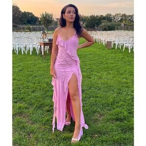 Pink flowy maxi dress with ruffled details. Asymmetric hem. V-neckline. Thin straps. Open back. Side zip fastening. Side slit. From MANGO, in US size 6 (EUR M, IT M) and 8 (EUR L, IT L). New with tags. Sold out in stores.