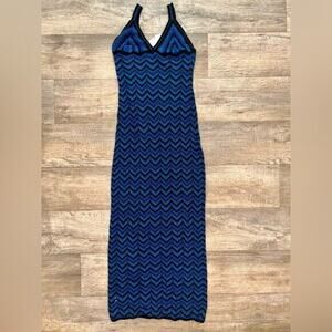 BLOGGER FAVE!!! Blue/black openwork knit maxi dress with metallic threads. Geometric print. V-neck. Thin straps. Open back. From MANGO, in US size 6 (EUR M, IT M) and 8 (EUR L, IT L). New with tags. Sold out in stores.