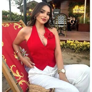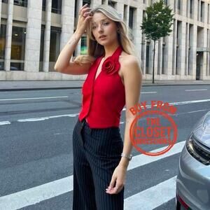 RARE!!! BLOGGER FAVE!!! Red fitted vest with flower detail. Halter neckline with wide straps. Two welt pockets on the front. Button fastening on the front section. From MANGO, in size S, M and L. New with tags. Sold out in stores.