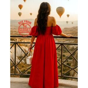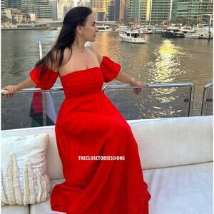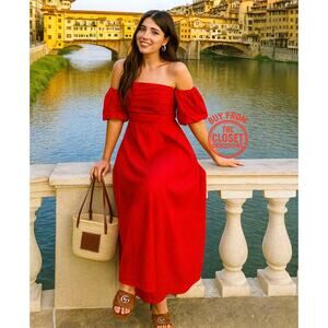 RARE!!! Red poplin midi dress. Square neckline. Puffed short sleeve. Gathering on the upper section. Interior cotton lining. From MANGO, in US size 6 (EUR M, IT M). New with tags. Sold out in stores.