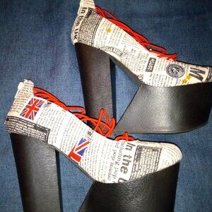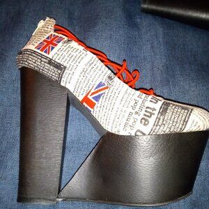 ( RARE !) MONA MIA DYNAMO UK FLAG PRINT Sculptural Cutout Wedge Booties