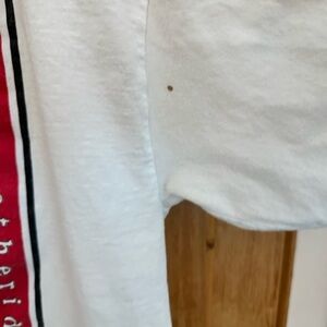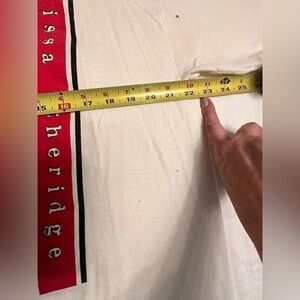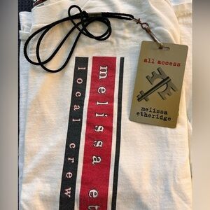 My husband ran the video for Melissa Etheridge’s 1996 tour and this is an authentic crew tee (I have added his credentials in the final picture just to show that he was part of the official crew. The credentials do NOT come with the T-shirt). T-shirt has some spots and some discoloration which I’ve tried to show clearly.