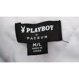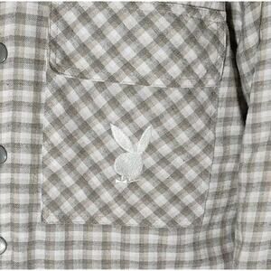 The product is a rare men's jacket from PacSun featuring a Playboy logo design in khaki plaid. It is made of polyester with a quilt-lined interior and runs big in size, fitting comfortably in the medium to large range. The jacket is ideal for casual occasions, has a button closure, and is machine washable for easy maintenance. Perfect for adding a touch of modern style to your wardrobe, this hoodie is suitable for various seasons and activities like walking or skateboarding.