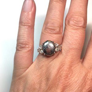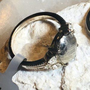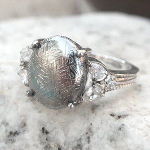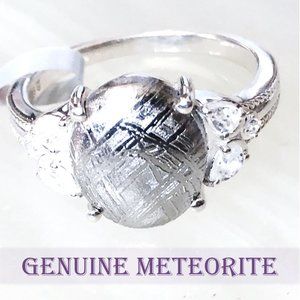 Genuine Muonionalusta Meteorite .925 Sterling Silver ring. If you've seen meteorite jewelry, most likely it was a thin sliver of meteorite coated with metal or a layer of quartz or glass. This ring features a solid cabochon of Meteorite measuring 10x12 mm set in an elegant Silver setting. This is a Limited Edition item (only 34 were made) imported from the UK. I have another meteorite ring listed separately, it would generally be considered more of a unisex or men's ring (gents' ring). Note that the video shows 2 different rings, only the one on the left is still available.