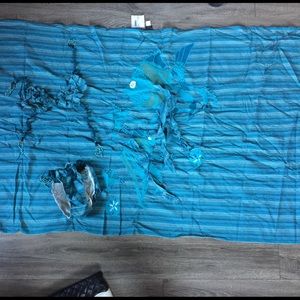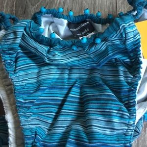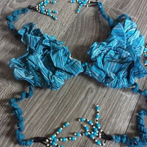 Brand new in Michael Simon bag, extremely rare and the detail is amazing. The bikini bottoms have a ruffled butt with beads. The top has ruffles and lots of beads. The caftan has fish with fringe tassels hanging from them. Fringe and beads on each end. Can be worn several different ways or used as a beach blanket. Stunning set. Bikini Sz medium. AF