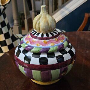 This is an AUTHENTIC RARE MACKENZIE CHILDS PICCADILLY GARLIC KEEPER. VERY RARE! This was RETIRED and NO LONGER AVAILABLE. LOVELY and CLASSIC Piccadilly design on this piece! This is ceramic and HANDMADE in Aurora, NY and HAND-PAINTED. This was purchased directly from Mackenzie Childs. CLASSIC and WONDERFUL addition to any table or kitchen, or whatever you desire!! The lid is roped. It measures approximately "L (from top to bottom with the lid on) by "W. Hand washing is recommended. This is NOT Dishwasher safe nor microwave safe. Comes from a non-smoking home. This is individually handmade and hand-painted...thus, no two are exactly alike. This is BRAND NEW without the sticker.. Pictures of actual item.