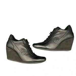 Stand tall in bold style with these hard-to-find No Name black leather wedge heels. Designed with a chunky platform, square toe, and lace-up closure, these rare shoes are a must-have for lovers of Y2K fashion, edgy streetwear, and gothic glam.