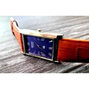 RARE NOS Seiko Men Tank Rectangular Blue Dial Leather band Dress Watch …