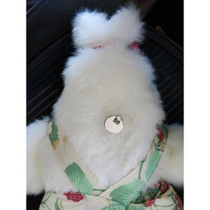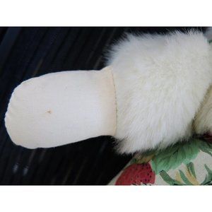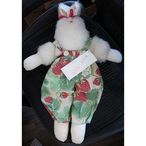 Here's a vintage and very hard to find WOOF & POOF sweet bunny rabbit! This is absolutely adorable! The white fur is so soft and her face is embroidered. She has a pink bow that matches her strawberry patch overalls. Her soft body is made with tea-dyed fabric so there is some variation in the coloring.