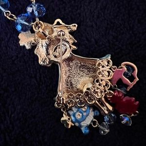 RARE - This is Brand New Authentic Kirks Folly Alice in Wonderland Pin Brooch and Necklace. It can be worn as a pin or as a necklace with a fancy link chain decorated with light blue faceted beads. You can see the Cheshire Cat, roses from the Red Queen's garden, and shimmering aurora borealis crystals that dangle from Alice's party dress.