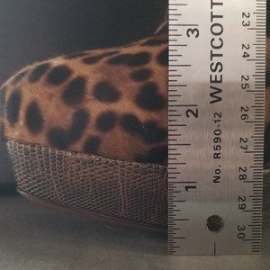 These are some of the most beautiful boots that I have seen. They are made of leather and suede with a leopard print. The platform has a reptile look wrap around it and their are reptile accents wrapped around the top of the foot and at the top of the ankle. There is a rear zipper to help with putting them on. These are made for a thinner foot and do not give to make room. The booties come in the original box from Alaia and include the protective cloth bags to keep your new boots protected when you are not wearing them.