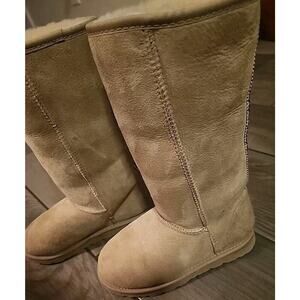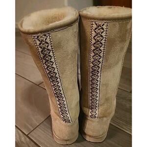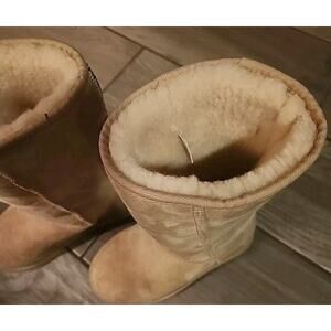 Step out in style this winter with these rare New Zealand made suede shearling sheep boots. These boots feature a round toe shape and a pull-on closure for easy wear. The shoes come in a size 6.5 and are perfect for casual occasions.