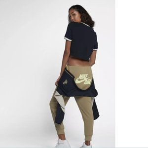 Super cute design in a khaki, cream and black colorblock long sleeve jumpsuit. It features an internally adjustable waist, ribbed collar and cuffs and has a tapered leg/jogger style. One cool feature is the garment’s convertibility. Should you choose to wear the top down, the back of the garment reveals Nike Air and Swoosh branding.