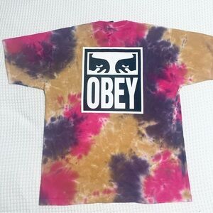 Rare, and excellent used condition, OBEY tee featuring the brand’s iconic logo at the chest and back. Tie-dyed cotton is cut in a classic fit with ribbing at the crew neckline. Finished with short sleeves and a flat hem. **Content + Care** \- 100% Cotton \- Machine wash \- Imported **Size + Fit** \- Measurements taken from size Medium \- Chest: 20” \- Length: 23”