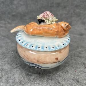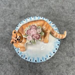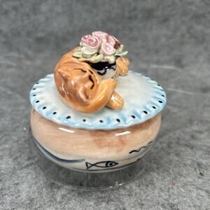 RARE Olga Goldin Signed Sleeping Tabby Cat Ceramic Trinket Box W/Flowers Fish